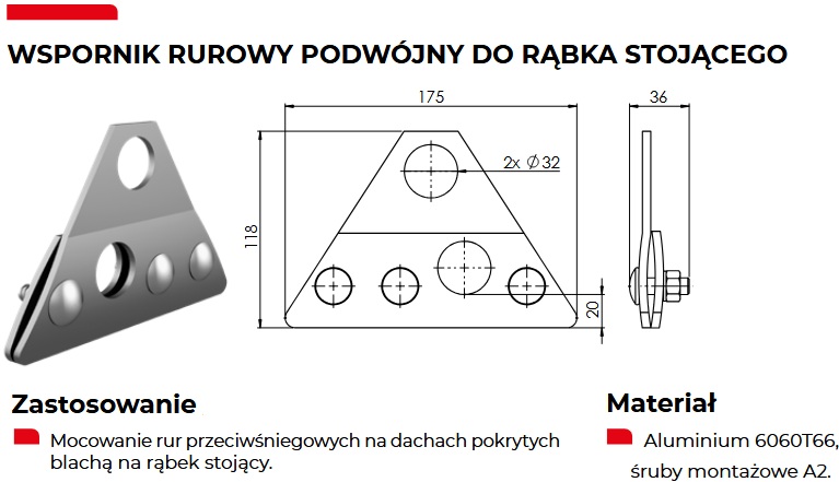 - 4 wsporniki podwójne aluminiowe do rur przeciwśniegowych – dedykowane do blachy na rąbek tradycyjny, ze śrubami A2.